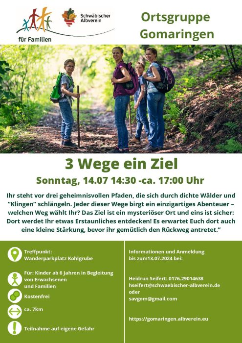 Die Gomaringer laden zu einem Familienprogramm am Sonntag, den 14.07. von 14:30 bis 17 Uhr ein: „Drei Wege – ein Ziel“. Start ist am PP Kohlgrube.