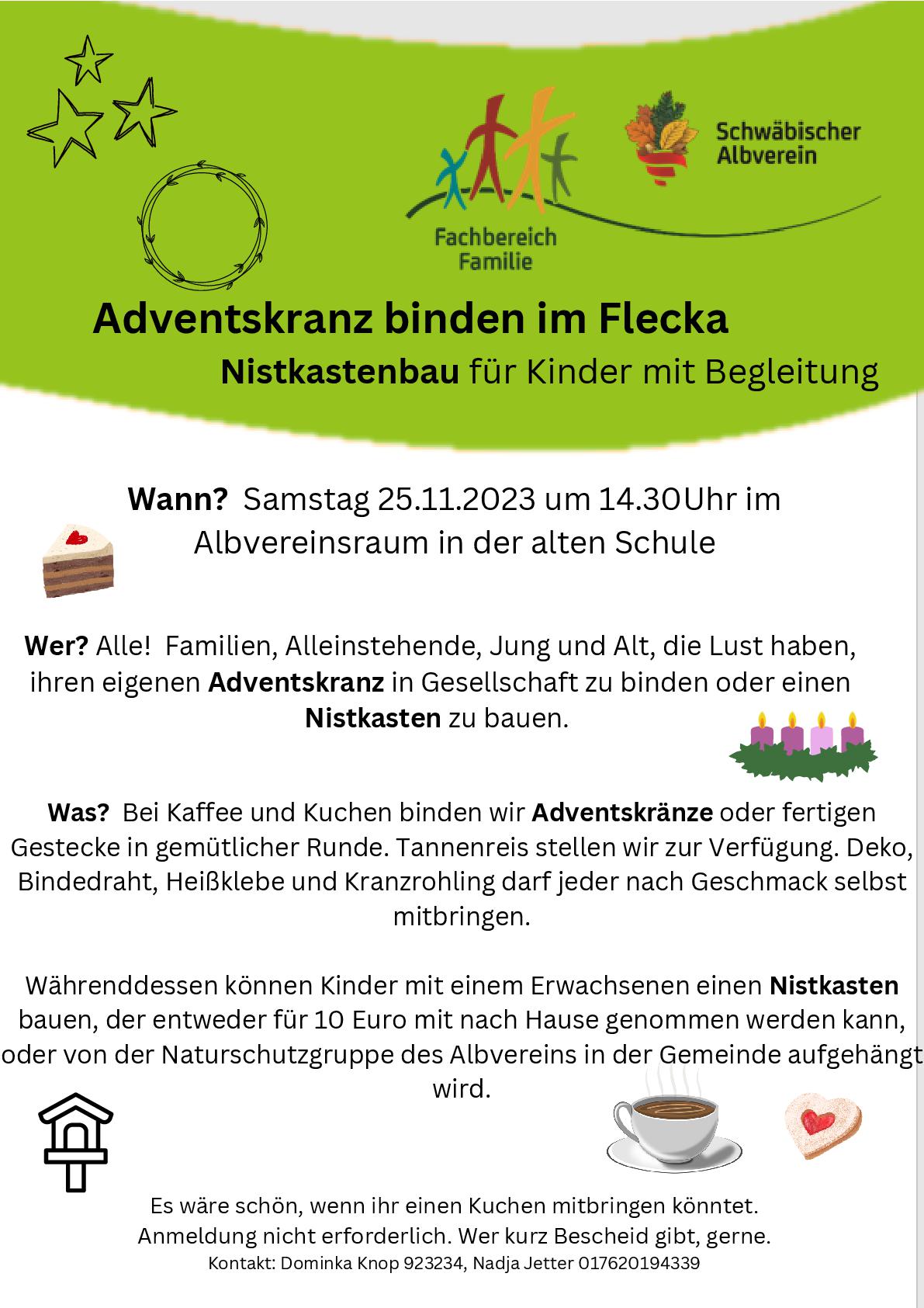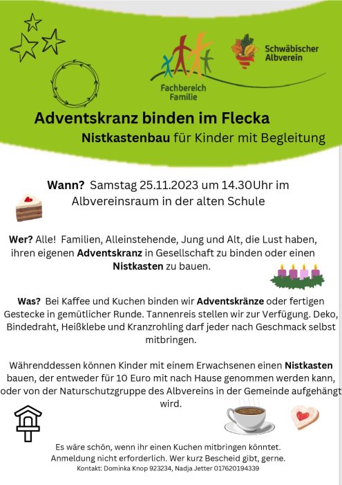 Adventskranz binden im Flecka und Nistkastenbau für Kinder Sa., 25.11.2023, Bronnweiler Uhrzeit: 14:30 Ort: Reutlingen-Bronnweiler Im Wiesaztal 17 72770 Bronnweiler iCalendar Mit dem Laden der Karte akzeptieren Sie die Datenschutzerklärung von Google.Mehr erfahren Karte laden Google Maps immer entsperren zur Übersicht