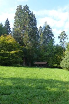 Hier in „Wellingtonien“ stehen ein paar prächtige Exemplare des Mammutbaumes, dessen bekanntester Vertreter in der Region sicher der Mammut an der Bronnweiler Kirche ist. Vom Rastplatz an den Riesenbäumen wird noch ein Stück bergauf geradelt.