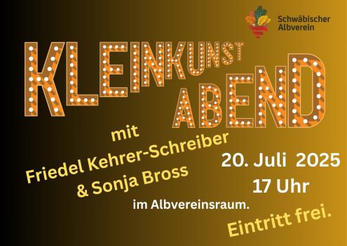 Am 20. Juli von 17 bis 19 Uhr laden wir zu einem Kleinkunstabend im Albvereinsraum mit Friedel Kehrer-Schreiber und Sonja Bross ein. Sie präsentieren Lieder, Gedichte und Sketche. Wir freuen uns auf euer Kommen!
