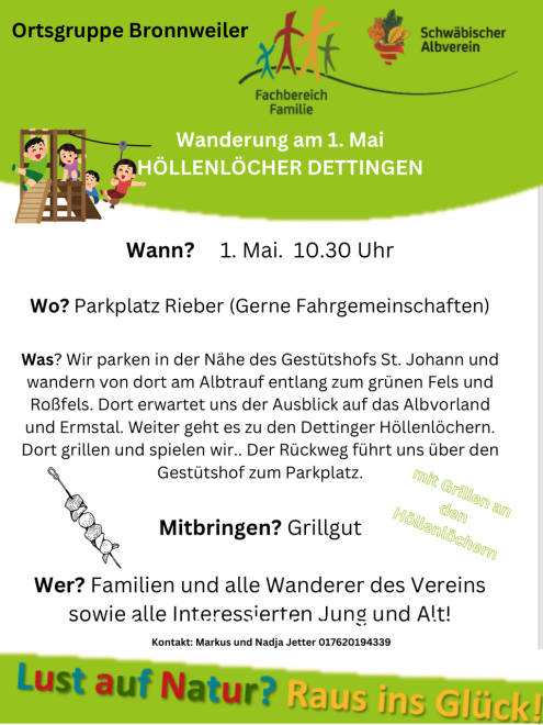 Vom Parkplatz am Gestütshof Sankt Johann geht es am Albtrauf eintlang zum Grünen Fels und zum Roßfels mit herrlichem Ausblick über Albvorland und Ermstal. Bei den Dettinger Höllenlöchern gibt es eine längere Pause zum Grillen, Essen, Schwätzen und Spielen. Von dort geht es zurück zum Parkplatz.