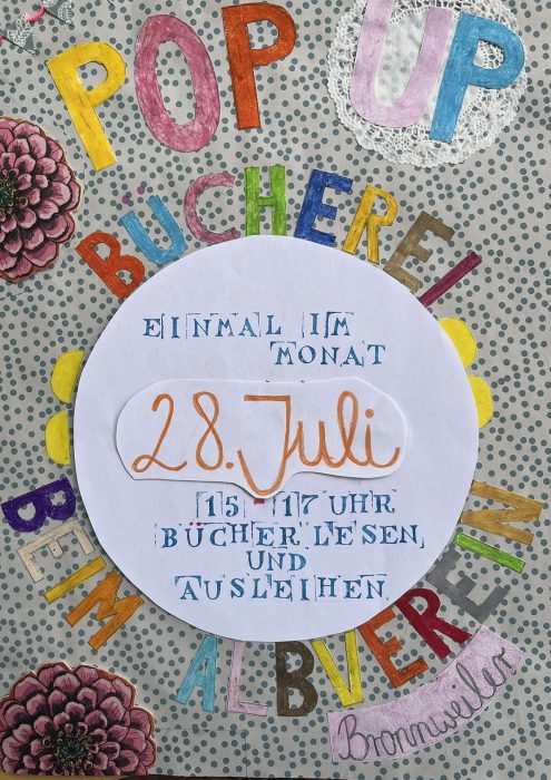 Gleich zweimal gibt es im Juli Pop-Up!-Bücherei beim Albverein. Einmal am Montag, den 7. Juli und noch einmal vor den großen Ferien am Montag, den 28. Juli. Jeweils von 15 bis 17 Uhr für alle und morgens von 9:30 bis 10 Uhr für die Kinder des Kindergartens Bronnweiler. Wir immer Lust auf Sommerlektüre oder Bücher zum Vorlesen hat, ist herzlich zu einem Besuch eingeladen.