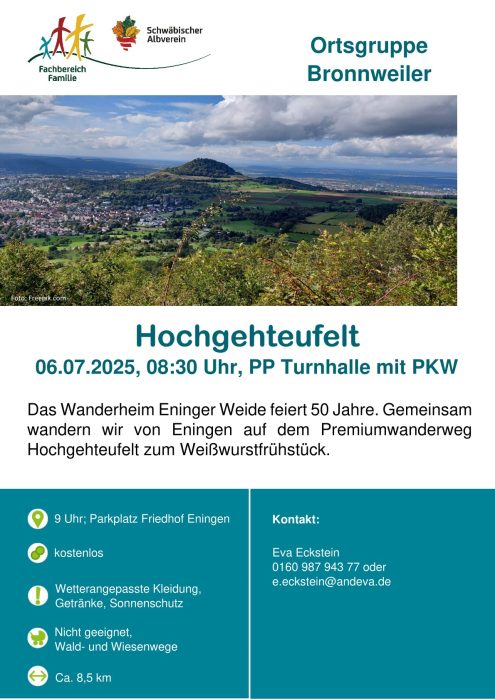 Das Wanderheim Eninger Weide feiert sein 50-jähriges Bestehen. Dazu wird unter Anderem am Sonntag, den 6. Juli ab 10:30 Uhr zu einem Weißwurstfrühstück eingeladen. Zudem wurde letztes Jahr der neue Premiumwanderweg „Hochgehteufelt“ eröffnet. Das nehmen wir zum Anlass, dort eine Wanderung anzubieten. Ich lade euch sehr herzlich zur Wanderung „Hoh´chgehteufelt“ am Sonntag, den 6. Juli ein. Start ist um 8:30 Uhr mit Autos an der Turnhalle Bronnweiler – Mitfahrgelegenheit gegeben. Wir fahren nach Eningen zum Friedhof. Von dort steigen wir über die Alte Steige und die Teufelsklinge hinauf auf die Schwäbische Alb und wandern über die Eninger Weide zum Wanderheim. Nach Pause und Stärkung geht es über zwei herrliche Aussichtspunkte zurück nach Eningen. Die Wanderstrecke beträgt ca. 9 km. Bitte gutes Schuhwerk anziehen und nicht an der Wasserflasche sparen! Ich hoffe, wir sind vor der großen Hitze zurück (falls es ein heißer Tag wird). Kontakt: Eva Eckstein 0160 987 943 77.